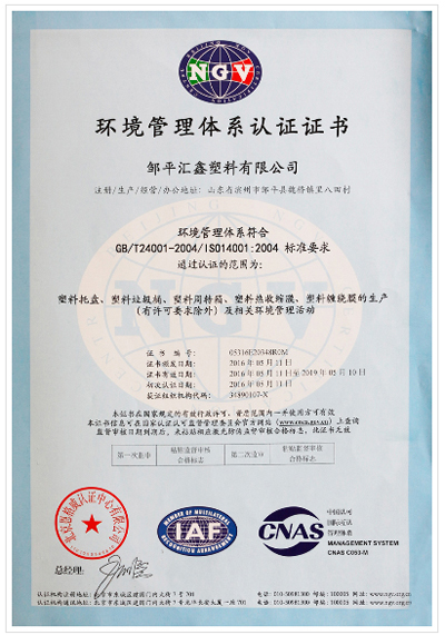 塑料托盤生產廠家環境管理體系認證證書